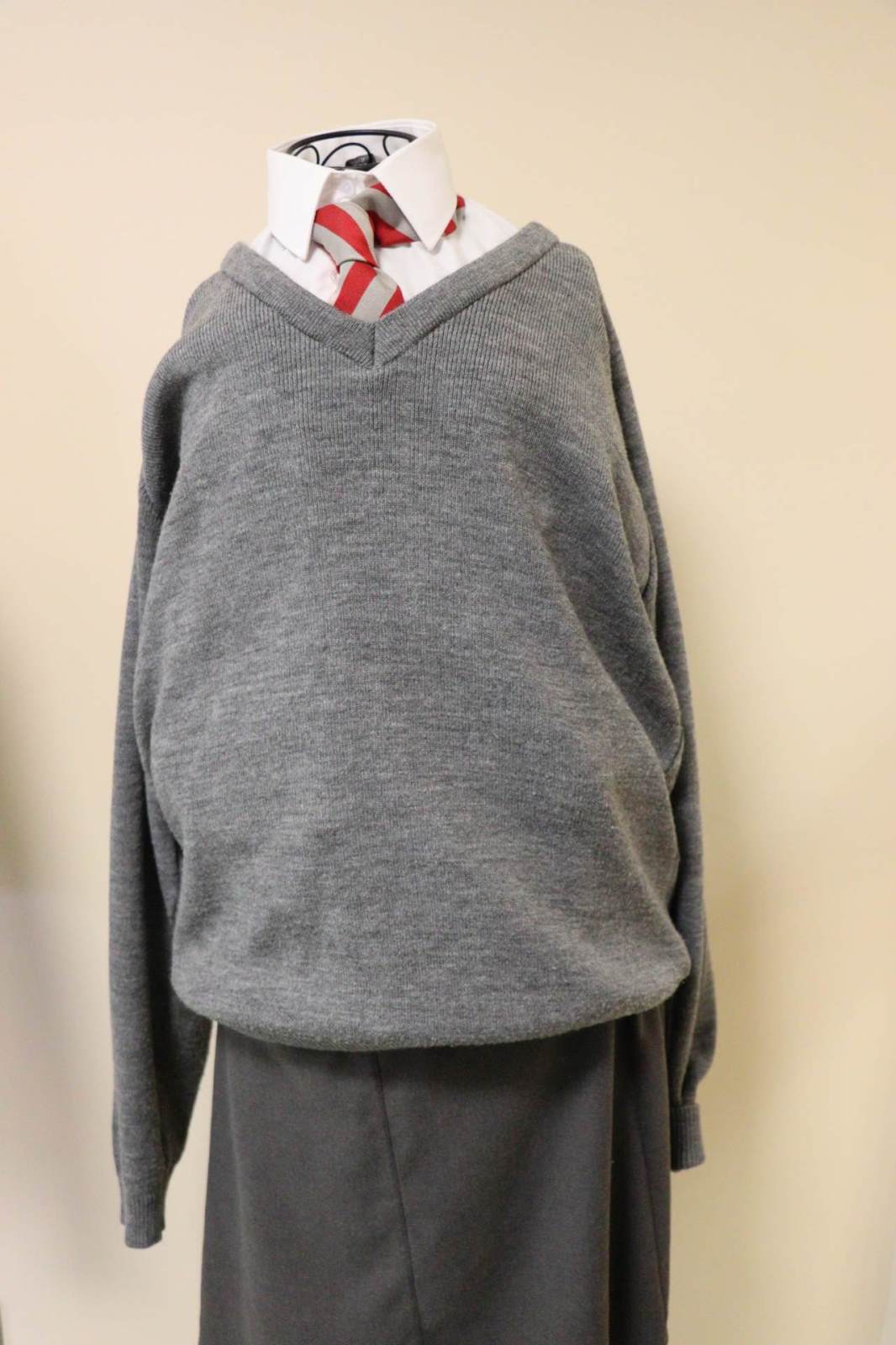 Boys: Grey V-neck jumper (no logo), white shirt (no logo), red /silver tie (no logo) and grey trousers (no logo).